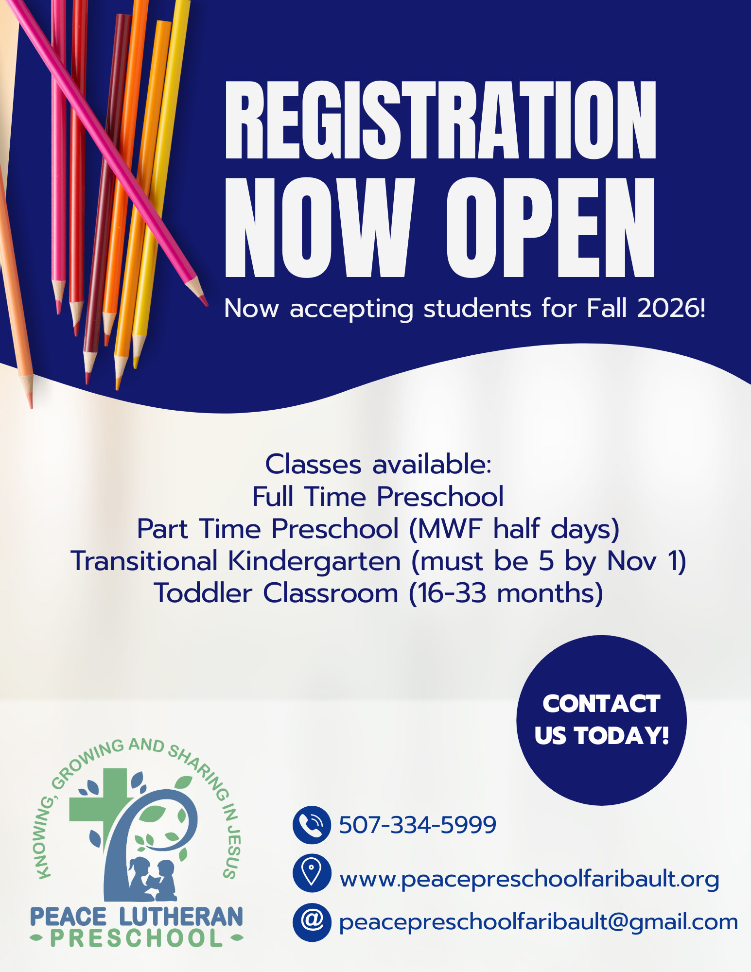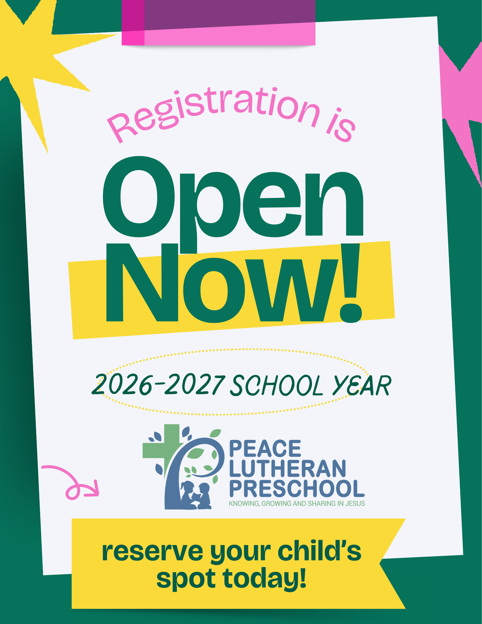 If you’re looking for a Preschool that teaches both Biblical and Early Education lessons, gives children a chance for friendships, and encourages the development of spiritual, academic, physical, social, and emotional aspects, then Peace Lutheran Preschool is the right fit for you!